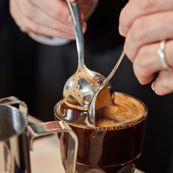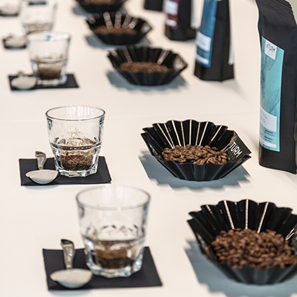 Die Ausstattung für die fachgerechte Durchführung ist überschaubar: Ein sauberer Cuppinglöffel aus Edelstahl hilft, den Kaffee zu dosieren, zu temperieren und effizient zu schlürfen. Als Trinkgefäß dient ein gereinigtes, geruchsneutrales Glas mit einer Füllmenge von 207 ml bis 266 ml und einem oberen Durchmesser von 76 mm bis 89 mm. Frische Kaffeebohnen dürfen bei keinem Cupping fehlen. Gemahlen werden die Bohnen mit einer handelsüblichen Kaffeemühle, wobei ein mittlerer bis grober Mahlgrad die besten Ergebnisse liefert. Mit Waage, Stoppuhr und Wasserkocher werden Kaffee und Wasser präzise für die Verkostung vorbereitet. Zu guter Letzt empfehlen unsere Baristi, einen hellen und gut gelüfteten Raum zu nutzen. Auch beim Parfüm sollten sich die Teilnehmer zurückhalten, um die Aromen des Kaffees nicht zu verfälschen.